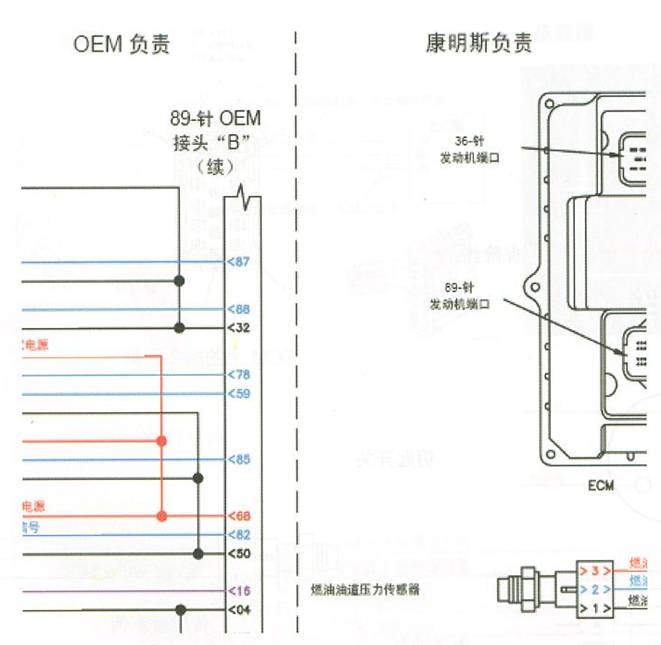 康明斯提供的發動機安裝到主機廠設備上,需要主機廠完成一系列的接線,其中包括ECU(M)的供電電路、發動機的啟動電路、油門電路、指示燈和控制開關電路等等。在康明斯電路圖中通過一根虛線將整個電路圖一分為二,圖中標明左邊電路為OEM(主機廠)負責,右邊電路為康明斯負責,即左邊電路由主機廠負責安裝,右邊電路為發動機的出廠狀態。