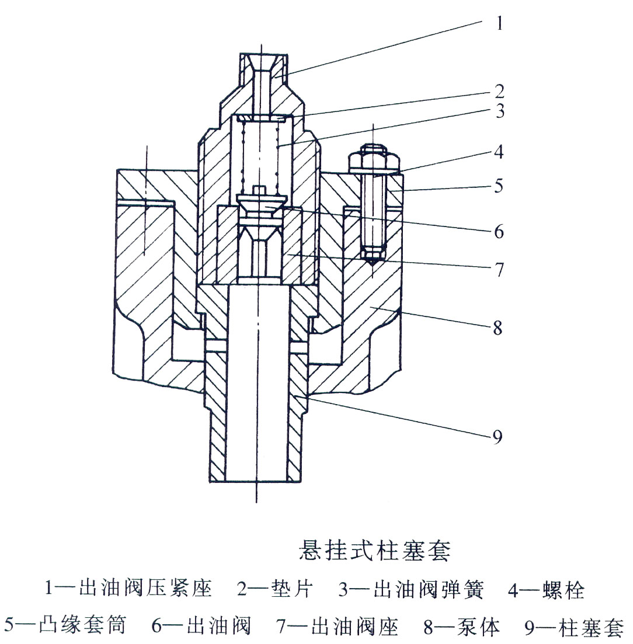 P型噴油泵懸掛式分泵柱塞套結構與工作原理、寧南汽配城賣康明斯配件皮帶零件查詢船用柴油機配件附近哪里有珀金斯發動機換四配套, 柱塞套9和出油閥6、出油閥座7都在凸緣套筒5內,并利用出油閥壓緊座1擰緊,使它成為一個獨立的組件。然后用兩個螺栓將凸緣套筒固定在泵體頂端面上,形成一種懸掛式結構。在出油閥壓緊座擰緊后,柱塞套僅僅是上部臺肩承受壓力,而進、回油孔部位都不受力,從而避免了柱塞套在進、回油處受壓變形。