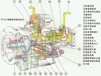 PT燃油系統(tǒng)的基本結(jié)構(gòu)形式:它由油箱、燃油濾清器、PT燃油泵、低壓輸油管、噴油器、搖臂、推桿、噴油凸輪和回油管等組成。其中:PT燃油泵又包括:齒輪泵、磁性濾清器、脈沖膜片減振器、兩極調(diào)速器、 節(jié)流軸、電磁閥等。