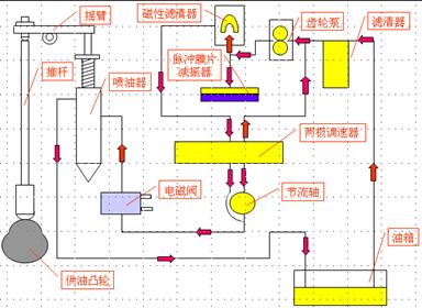 如圖所示為發(fā)動(dòng)機(jī)燃油流動(dòng)圖:燃油泵將燃油從油箱中吸起,經(jīng)過濾清、調(diào)速器等送到噴油器,根據(jù)PT系統(tǒng)的設(shè)計(jì),PT泵供給噴油器的燃油將有80%左右在工作中經(jīng)噴油器又回到油箱,主要起冷卻和潤(rùn)滑噴油器,并防止寒冷氣候時(shí)燃油凍結(jié)及將PT系統(tǒng)里的空氣帶回油箱排掉的作用。