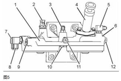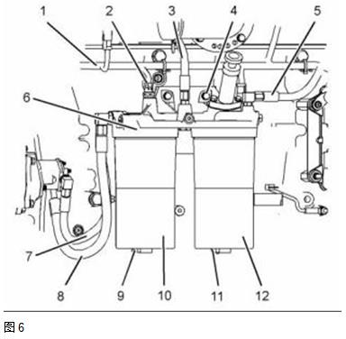 4. 安裝新的 O形密封圈至燃油旁通閥 (6).安裝燃油旁通閥至燃油濾清器底座總成(1). 擰緊燃油旁通閥 (6) 至扭矩 35 N•m (26 lb ft).