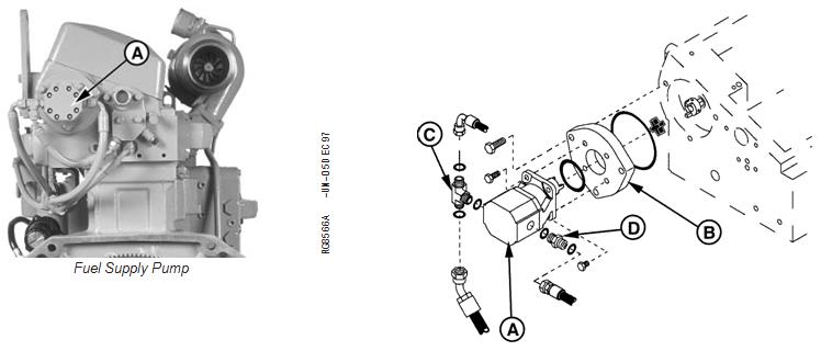 4. If removed, apply AR54749 Soap Lubricant to new O-ring on supply pump mounting bracket (B) and install. Tighten mounting bracket cap screws to specifications.
