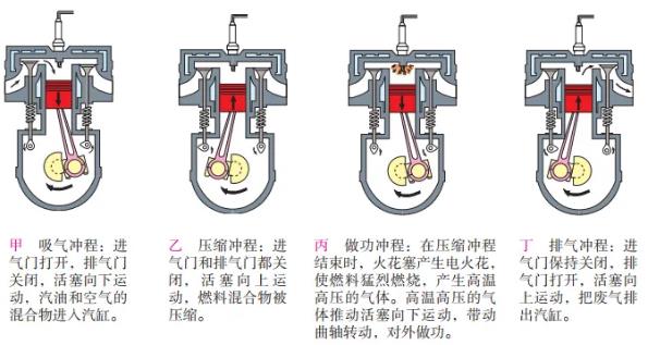 ①兩種發(fā)動機中,每完成一個工作循環(huán),曲軸均轉兩周(720°);每完成一個行程,曲軸轉半周(180°)。進氣行程是進氣門開啟,排氣行程是排氣門開啟,其余兩個行程進、排氣門均關閉。