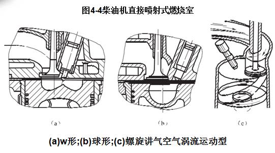 直接噴射式燃燒室常見的結構形式(如圖4 -4所示)是由凹形活塞頂與汽缸蓋底面所包圍的空間組成,也稱統一式燃燒室。幾乎全部燃燒室容積都在活塞頂面上,按活塞頂面形狀不同,又可分為ω形、球形等。