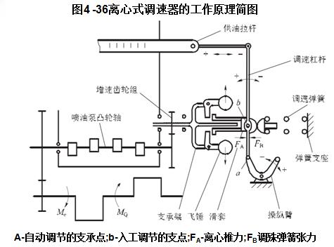 柴油機在工作時,通過曲軸驅動裝在噴油泵凸輪軸后端上的飛錘旋轉,飛錘受離心力的作用而向外飛開。此離心力產生的推力FA和調速彈簧的張力FB。在某一轉速下相平衡,而使調速器和噴油泵保持在一定的位置下工作。