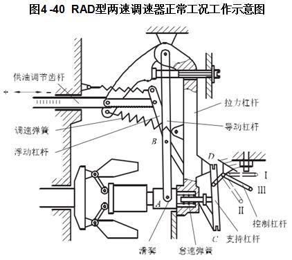 圖4 - 37所示為CA1091 K3型載貨汽車柴油機所用的RAD型兩速調速器,其調速原理結構示意圖如圖4-38所示。