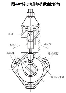 如圖4-62所示,泵體前端是三角形凸緣盤,其上開有三條弧形槽,用螺栓將其固定在驅動齒輪后面的箱體上。調整時,松開螺釘,轉動殼體,根據凸輪軸的驅動方向,逆凸輪軸轉向轉動殼體時,供油提前角變大;反之則減小。