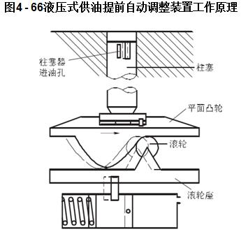 在噴油泵處于靜止狀態時,活塞在彈簧力作用下,被推向右側。當柴油機工作后,泵內燃油壓力升高。當活塞兩邊失去平衡時,活塞開始向左移動,通過連接銷、撥銷推動滾輪座沿順時針方向轉動,即滾輪座相對于平面凸輪轉動,迫使平面凸輪提早頂起,供油提前角增大而使供油提前;反之,轉速降低,滾輪逆時針方向轉動,即滾輪座順著平面凸輪轉動,供油提前角減小而使供油滯后,如圖4-66所示。