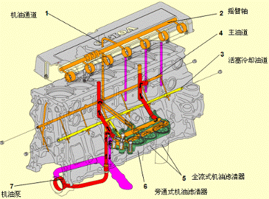 在機油泵上設有限壓閥(又稱安全閥),當機油泵輸出壓力較高時,限壓閥打開,將機油直接送回油底殼,防止進入主油道的機油壓力過高。濾清器、冷卻器等處的進油孔與出油孔之間設有旁通閥。當上述裝置堵塞造成通過能力下降時,旁通閥打開,機油直接進入主油道,以保證主油道的機油壓力。主油道上設有溢流閥,當主油道壓力過高時,溢流閥打開,機油直接流回油底殼。