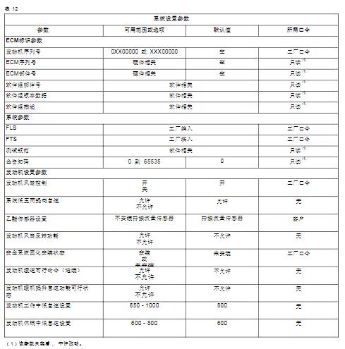 發動機序列號編入“發動機序列號”以匹配標記在發動機銘牌上的發動機序列號。發動機序列號不預先編入替換的ECM中。ECM部件號該參數標示了ECM的部件號。ECM序列號該參數標示了ECM的序列號。軟件組部件號該參數表示當前裝入ECM中的快存文檔的部件號。軟件組版本數據該參數表示當前裝入ECM中的快存文檔的版本數據。軟件組描述該參數表示當前裝入ECM中的應用軟件的描述。全載荷設置(FLS)FLS是由工廠設定的,表示燃油系統調節情況的參數,以良好調諧燃油系統。該參數的正確值標記在發動機信息銘牌上。這個值只有在發動機重調或安裝新ECM時才進行改變。改變該參數需要工廠口令。全扭矩設置(FTS)FTS與FLS相類似。這個值只有在發動機重調或安裝新ECM時才進行改變。改變該參數需要工廠口令。額定功率該參數表明發動機的額定功率。
