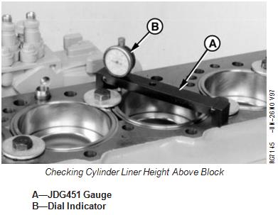 2. Using JDG451 Gauge (A) along with D17526CI (English) or D17527CI (Metric scale) Dial Indicator (B) or KJD10123 Gauge, measure the height of bolted down liners that are not obviously defective before removal from block.
