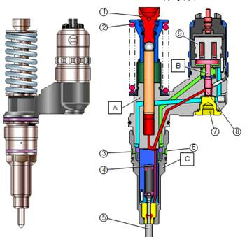 The course of their work: when a cylinder needs fuel injection ECU to the solenoid valve 3.7V voltage (Note: When starting voltage up to 90V so ordinary multimeter can not measure), the solenoid valve moving Inlet Road blocked so formed inside the confined space, the plunger moves upward in the camshaft driven the establishment of hydraulic until it reaches 220kg open the injector jet by the atomization of fuel into the cylinder, the work is completed.
