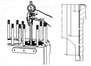 注意:結(jié)合氣閥導(dǎo)筒內(nèi)徑的測(cè)量結(jié)果,計(jì)算閥桿及導(dǎo)筒的間隙。當(dāng)間隙超過(guò)更換極限時(shí),更換磨損嚴(yán)重的閥。