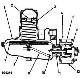 (1)彈簧側(cè)室(2)調(diào)節(jié)螺絲(3)彈簧(4)出口(5)閥盤(pán)(6)主噴嘴(7)主通風(fēng)口(8)控制桿側(cè)室(9)控制桿(10)鎖銷(xiāo)(11)閥桿(12)進(jìn)氣口