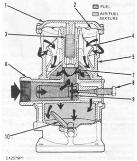 在不增壓卡特CAT發(fā)動(dòng)機(jī)上,空氣流經(jīng)空氣過(guò)濾器進(jìn)入化油器空氣管道。在渦輪增壓卡特CAT發(fā)動(dòng)機(jī)上,空氣被吸入卡特CAT發(fā)動(dòng)機(jī),流經(jīng)空氣過(guò)濾器到達(dá)化油器渦輪增壓器,而后被推入后冷卻機(jī)核到達(dá)化油器空氣管道。在空氣管道中,空氣環(huán)繞氣閥體(5)流動(dòng),然后被推入隔膜(2),再向下流經(jīng)氣閥中央,環(huán)繞燃?xì)膺M(jìn)氣體(6),通過(guò)節(jié)流板(10)最后進(jìn)入卡特CAT發(fā)動(dòng)機(jī)。