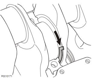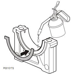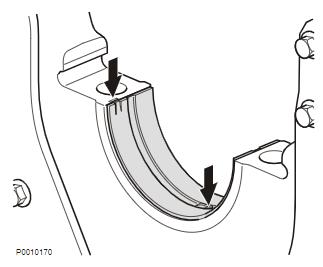 5 將主軸承蓋擦干并安裝新軸承。用發動機機油潤滑軸承表面。將止推墊圈安裝到中心主軸承蓋上(將定位調整片裝入槽口中)。中心主軸承蓋有一個必須緊靠發動機機體中的定位調整片進行安裝的凹槽。