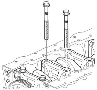 6 根據標記安裝軸承蓋。使用螺栓使軸承蓋保持豎直。擰緊螺栓,從而將軸承蓋向下拉到發動機機體上。檢查并確認曲軸可以轉動。使用 885811 計時工具、885633 扭矩倍增器和885648 反向固定器根據特殊緊固扭矩 8 頁扭矩和角度緊固軸承蓋螺栓。再次檢查并確認曲軸可以轉動。