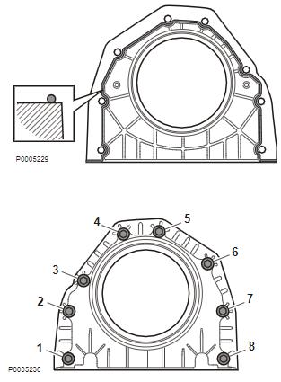 10 從蓋上拆下前曲軸密封件。在要安裝蓋的位置清潔蓋和發動機機體。在蓋上涂抹密封劑;參見特殊緊固扭矩。安裝蓋并按順序擰緊螺栓;參見特殊緊固扭矩。
