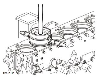 2 用活塞環夾子和連桿將活塞提升就位(大端軸承已潤滑)。確保活塞朝向正確的方向(這樣,連桿便處于曲軸上的正確位置)。用錘柄向下敲擊活塞。當活塞處于活塞環夾子下方時,拆下活塞環夾子。重新安裝缸套用壓緊工具。向下按壓活塞,使連桿接觸曲軸。安裝大端軸承蓋,將其與曲軸恰好對準(大端軸承已潤滑)。安裝螺栓。扭矩緊固螺栓,檢查并確認曲軸可以轉動。