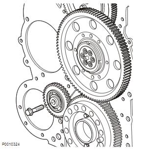 10 檢查雙齒輪軸承。使雙沃爾沃發(fā)動(dòng)機(jī)齒輪上的標(biāo)記與曲軸上的標(biāo)記對(duì)準(zhǔn)。對(duì)準(zhǔn)上部中間齒輪齒,將定位銷裝入中心孔中。轉(zhuǎn)動(dòng)輪轂,使螺栓孔對(duì)準(zhǔn)。安裝螺栓,根據(jù)特殊緊固扭矩 8 頁(yè)進(jìn)行緊固。