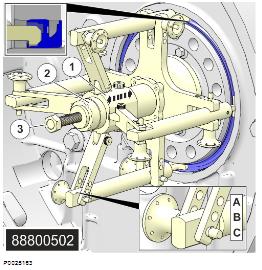 1 調整臂 88800501 安裝工具 并安裝工具。設定直徑:使用 A. Ø 151 前密封件 D13。1 前進:掛鉤松開向后:掛鉤扣緊2 張緊螺母3 緩慢拉出密封件。安裝重要事項!密封環的金屬側必須向內。