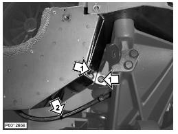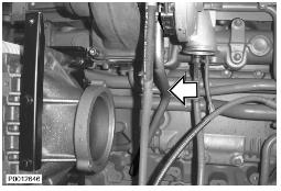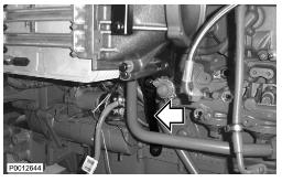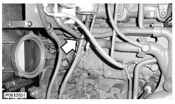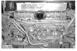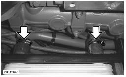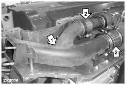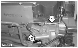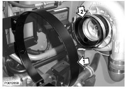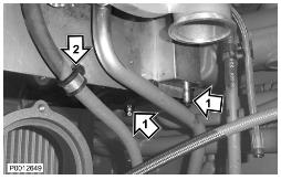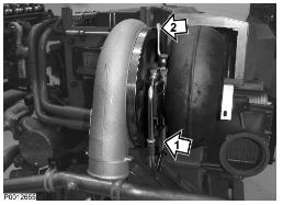 24 僅適用于 D13B-A/C/G/H/K/L,D13C2-A,D13C4-A(雙渦輪增壓器)緊固下部渦輪增壓器隔熱罩上的兩個螺栓(1)。將水軟管(2)夾緊至回油管上。