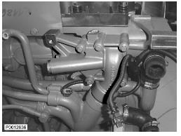 21 僅適用于 D13B-A/C/G/H/K/L,D13C2-A,D13C4-A(雙渦輪增壓器)安裝 Y 形管(1)并固定螺栓。不要完全緊固螺栓。用新密封墊圈安裝(2)撓性管。安裝夾子并緊固。注意 標注夾子的位置。緊固 Y 形管螺栓。注意 特殊扭矩,請參見安裝須知。緊固所有隔熱罩螺栓。注意 不要忘記前部螺栓或墊片位于歧管下面的兩個螺栓。