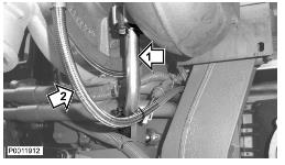8 拆下回油管(1)和電纜結(jié)。拆下用于冷卻水的下部冷卻劑軟管(2)。