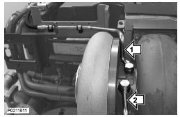 15 在沃爾沃渦輪增壓器中加注新的、干凈的發(fā)動機機油并用新密封件安裝供油管(1)。用夾子將管線固定到發(fā)動機吊眼上。用新密封件安裝新冷卻劑連接(2)。