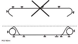 5 密封件必須使用沃爾沃遍達零件號 1161277 膠合。在兩半密封件相遇地方的上面和下面涂抹一層膠水。在圖示點涂抹膠水。擦去多余的膠水。安裝前等待 30 分鐘以上,以讓膠水干燥