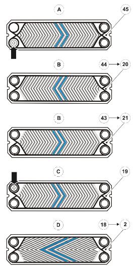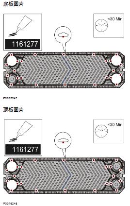 volvo沃爾沃冷卻板和安裝順序45 個板可供選擇P0016342A1 個底板(45)。圖案指向右邊。記錄已密封孔的位置。注意 唯一獨特密封件。B13 個精細圖案冷卻板。必須轉(zhuǎn)到每另一個板上的圖案指向左邊。(44、42、40......20)。B12 個精細圖案冷卻板。必須轉(zhuǎn)到每另一個板上的圖案指向右邊。(43,41,39 ...21)C1 個中間板(#19)。圖案指向右邊。記錄已密封孔的位置。D9 個粗糙圖案冷卻板。