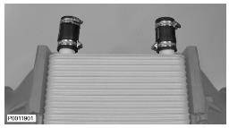 9 將增壓空氣冷卻器安裝到下部螺柱上。將螺柱連接導(dǎo)入增壓空氣管并導(dǎo)入冷卻水軟管。注意 確保軟管上有軟管夾。將增壓空氣冷卻器按壓到位;安裝上部螺栓并將螺母擰至螺柱上。緊固螺母。