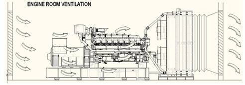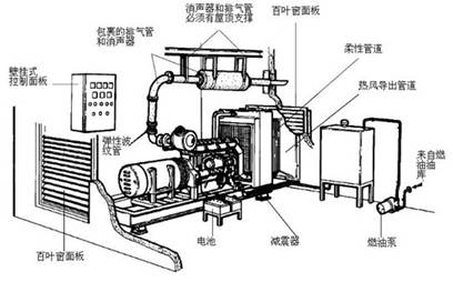 3. 典型的機(jī)房布置應(yīng)具有來自散熱器的熱風(fēng)用導(dǎo)風(fēng)管道排至機(jī)房外并且避免回流 排氣系統(tǒng)從屋頂進(jìn)行支撐,安裝彈性波紋管來隔離引擎和排氣系統(tǒng)熱風(fēng)導(dǎo)出管道,燃油管路和電氣相對引擎和交流發(fā)電機(jī)的連接,留有一點(diǎn)的余量日用油箱通過機(jī)房外遠(yuǎn)置安裝的油庫供應(yīng)在發(fā)動(dòng)機(jī)沒有運(yùn)行期間,啟動(dòng)電池必須使用充電器充滿,該充電器可以集成在控制柜內(nèi)。