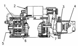 電磁閥(2)在空心氣缸周圍有繞組(一組或兩組)。彈簧加載的柱塞位于氣缸內(nèi)。柱塞可以前后移動。當(dāng)啟動開關(guān)閉合,電流通過繞組輸送時,產(chǎn)生磁場(1)。磁場(1)將柱塞在氣缸中向前拉。這會移動換檔桿,使小齒輪驅(qū)動齒輪與齒圈接合。然后,柱塞前端通過電磁閥(2)的蓄電池和馬達端子進行接觸。接下來,起動馬達開始轉(zhuǎn)動發(fā)動機的飛輪。當(dāng)起動開關(guān)打開時,電流不再流過繞組。彈簧現(xiàn)在將柱塞推回到原始位置。同時,彈簧使小齒輪遠離飛輪。