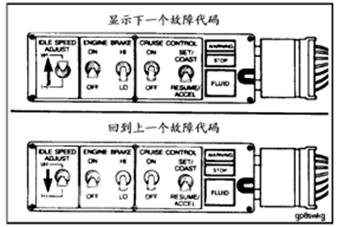 在指令系統開始其它操作之前,指示燈將一直閃爍同一個故障代碼。要想顯示下一個故障代碼,暫時把IDLE SPEED ADJUST開關扳到“(+)”位置,要想回到上一個故障代碼,把IDLE SPEED ADJUST開關暫時扳到“(-)”位置即可。如果只有一個現行故障,不論開關扳到“(+)”或“(-)”,系統都將連續顯示同一個故障代碼。