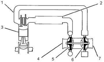 (1) 排氣岐管 (2)后冷器(3)發動機氣缸 (4)進氣口 (5)渦輪增壓器壓縮機葉輪(6)渦輪坩壓器堝輪葉鞋(7)排氣出口