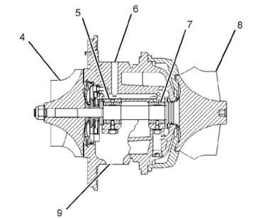 (4)壓縮機葉輪 (5)軸承 (6)機油進口 (7)軸承 (8)渦輪機葉輪 (9)出油口