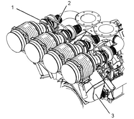 Perkins4016柴油發動機在發動機后端安裝了四個渦輪增壓器(1)。每個渦輪增壓囂的渦輪機側都連接至該渦輪增壓器的排氣歧管。每個渦輪增壓器的壓縮機側都通過管道與后冷器殼體相連。