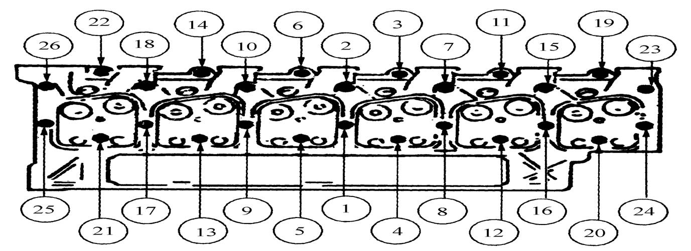 ①氣缸蓋安裝時,應把標有“缸體側”的一面朝向氣缸體,檢查水、油孔是否對齊。氣缸墊用過1次后不能再用。康明斯B系列發動機氣缸蓋螺栓的擰緊順序如下圖所示。