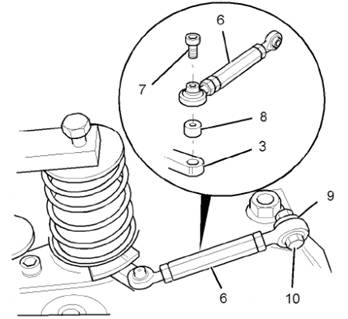 b將隔套(a)、連桿(6)和六角頭螺栓(7)安裝至控制臂(3)。特連桿(6)和螺栓(10)連接至回位桿(9)。將緊固件上緊到8 N-m (71 ib in)的扭矩。