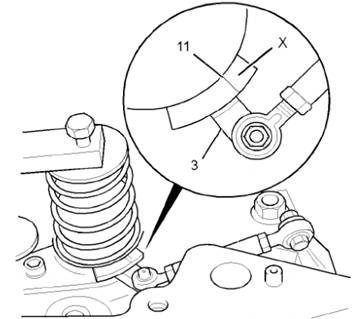 注:如果任何控制臂(3)低于噴油器上位匝(x)的刻線(11),移動調速器執行器并桿最低的噴油器用作標定點。
