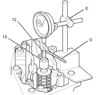 7將工具(E)安裝至氣缸的搖臂箱。特工具(E)的柱塞放置在調節器(12)的頂面上。確保工具(E)的刻度盤設置為零。