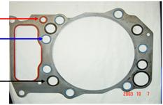 康明斯Cummins QSK23發動機缸墊的通道針對內部流動的不同流體使用不同的密封材料。 紅色的密封機油通道, 黑色的密封冷卻液通道, 藍色的密封缸蓋螺栓周圍。