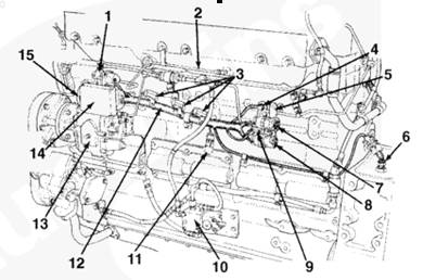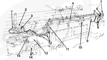 1油軌壓力傳感器,2燃油連接塊,3燃料切斷閥4發(fā)動機(jī)線束,5 C6 接頭,6 C5 接頭,7 OEM C5 和 C6 接頭支架,8發(fā)動機(jī)轉(zhuǎn)速傳感器,9系統(tǒng)接地接頭,10液壓機(jī)械式 STC 執(zhí)行器,11發(fā)動機(jī)側(cè)數(shù)據(jù)通信接頭,12保險絲 (5A),13 ECM,14燃油泵,15電子燃油控制閥。