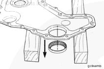 用木塊將前齒輪室蓋支撐在平坦的工作面上。使用適當的沖頭和錘子,從后向前將舊密封件頂出前齒輪室蓋。
