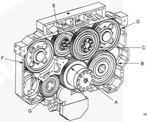 QSK78 在左排的凸輪軸惰輪和燃油泵驅動惰輪的位置采用加寬的正齒輪和復合齒輪。齒牙的直徑節距加大,以適應扭矩的增加。QSK78 采用兩件分離式曲軸齒輪,左排的凸輪軸驅動復合齒輪由 6 顆螺栓固定。