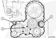 將新密封圈安裝在附件驅動安裝 (1) 和水泵安裝 (2) 位置。將 6 個新螺栓 O 形圈安裝在曲軸油封安裝螺栓位置 (3)。