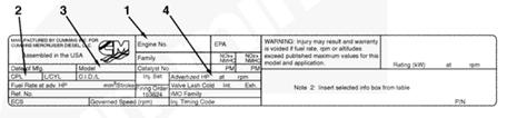 發動機銘牌顯示有關發動機的重要信息。發動機生產序號 (ESN) 和控制零件目錄 (CPL) 提供了訂購零件和服務所需信息。未經康明斯公司批準不得擅自變更發動機銘牌。