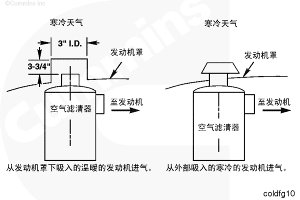 發動機進氣預熱通過從排氣管(圖 8)周圍、發動機艙外(圖 9 和 10)吸來空氣或經過一個中冷器實現。當在低于 -32° C [-25°F] 的環境溫度下連續工作時,總是希望并需要預熱空氣(特別是在較低負載下),以提供完全燃燒所需的條件。為了在約 -32° C [-25° 的溫度下工作,通常會使封閉發動機艙流出的空氣充分預熱。在更低溫度下,會在排氣總管附近的箱室(圖 8),使空氣經水套流到空氣濾清器。無論用于將空氣從發動機艙和/或排氣腔室抽出的布置類型如何,準備措施必須做出,目的是將將外部空氣吸入發動機進氣以便在更高溫度下運轉。這項建議適合于所有機型。