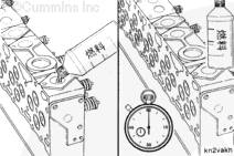 測試缸蓋是否損壞。將缸蓋放下,使排氣口朝上。向一個排氣端口灌入燃油,直到注滿為止。啟動定時器。